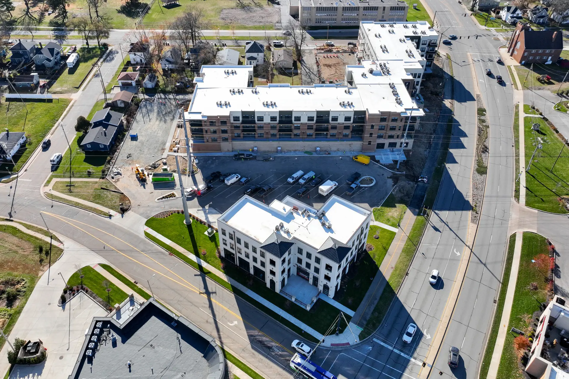 - Building Component: Apartments over retail and garage podium; site improvements